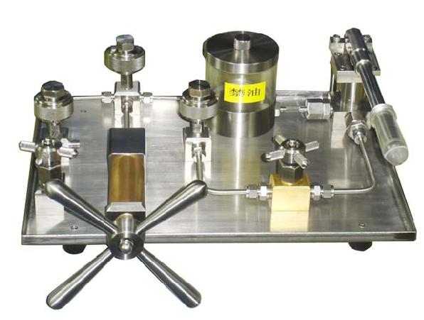 將微調調至適當位置(中間位置),關閉油杯上方截止閥。輕輕操作杠桿,使變壓器油至兩個壓力輸出接口。再安裝標準表和被檢表,操作杠桿升壓至65MPa左右時,使用微調調至60MPa,穩定2-3分鐘后,逐點檢測。(過壓保護閥在造壓前一直打開)
