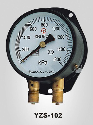 壓力表由兩套各自的測量系統(tǒng)和指示裝置組成。被測壓力作用于兩測壓元件(彈簧管)后致使管端各自產(chǎn)生相應的位移,經(jīng)傳動機構放大后,由固定在齒輪軸上的紅、黑指針遂將兩個被測壓力值分別在度盤上指示出來。