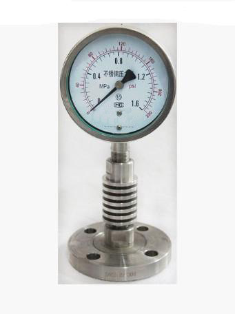 在耐溫壓力表的基礎上加裝不銹鋼隔離散熱器,內充隔離液體,測量的介質溫度可達≤450℃。主要測量高溫高壓的蒸汽壓力,適用于石油開采和熱點行業。