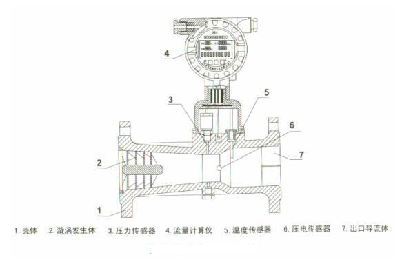 1、旋渦發(fā)生體 2、殼體 3、智能流量計(jì)積算儀 4、溫度傳感器 5、壓力傳感器 6、壓電晶體傳感器 7、消旋器